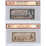Available for sale is a $100 1954 Bank of Canada Note Devil Face A/J Prefix BC-35a - BCS AU-55