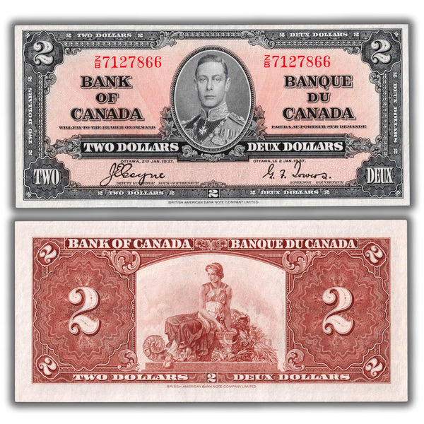 Available for sale is a $2 1937 Bank of Canada Note Coyne-Towers Z/B Changeover Prefix BC-22c - AU (cleaned)