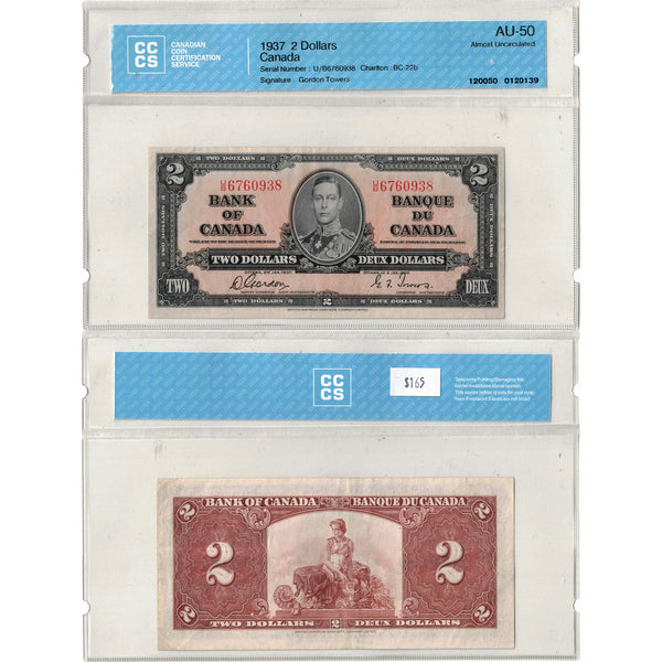 Available for sale is a $2 1937 Bank of Canada Note Gordon-Towers U/B Prefix BC-22b - CCCS AU-50