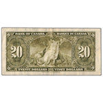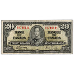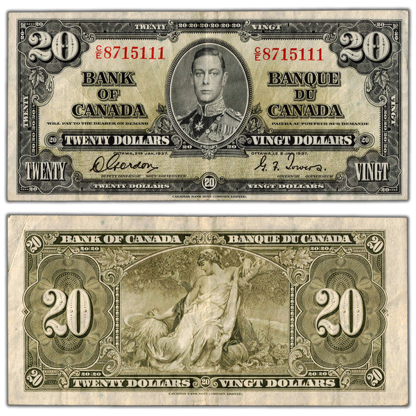 Available for sale is a $20 1937 Bank of Canada Note Gordon-Towers C/E Prefix BC-25b - VF