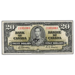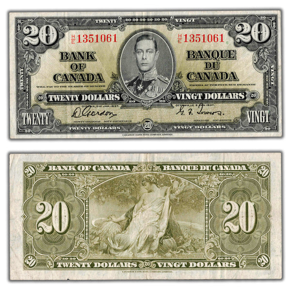 Available for sale is a $20 1937 Bank of Canada Note Gordon-Towers H/E Prefix BC-25 - VF