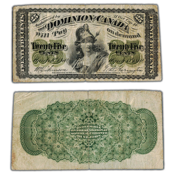 Available for sale is a 25 Cents 1870 Dominion of Canada Note Shinplaster Plain DC-1c - Fine