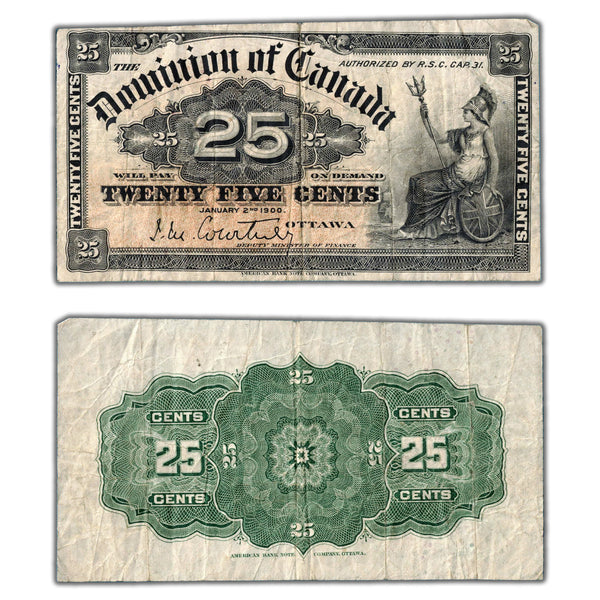 Available for sale is a 25 Cents 1900 Dominion of Canada Note Shinplaster Courtney DC-15a - Fine