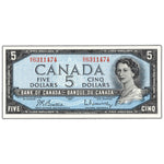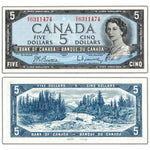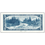 Available for sale is a $5 1954 Bank of Canada Note Beattie-Rasminsky G/X Prefix BC-39b - UNC (corner tip dmg)
