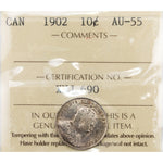 Available for sale is a Canada 1902 10 Cents Dime Silver Coin - ICCS AU-55