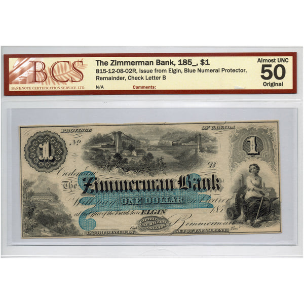 SOLD $1 1850's Zimmerman Bank Canada Chartered Note #815-12-08-02R - BCS AU-50
