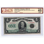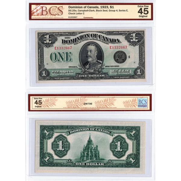 SOLD $1 1923 Dominion of Canada Note Black Seal Series E DC-25o - BCS EF-45