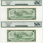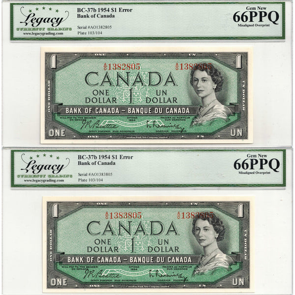 SOLD $1 1954 Bank of Canada Notes Misaligned Serials From Same Sheet - Legacy 66 PPQ