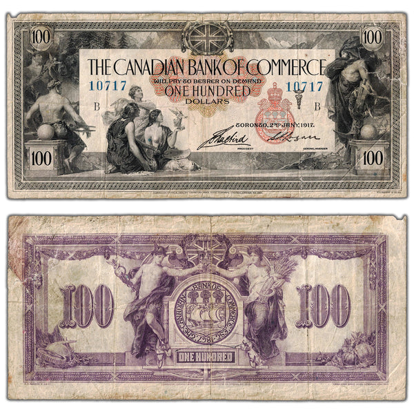 Available for sale is a SOLD $100 1917 Canadian Bank of Commerce Canada Chartered Note #75-16-02-12 - Missing Small Piece