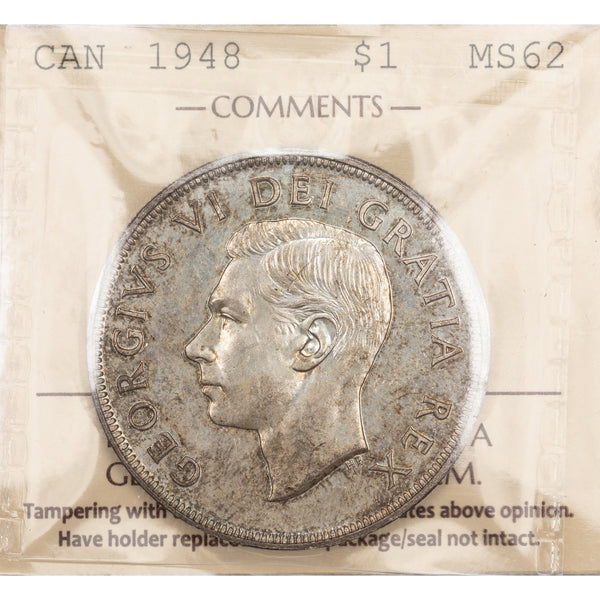 SOLD Canada 1948 $1 Silver Dollar Coin - Key Date - ICCS MS62 *Read Description PLEASE NOTE: There are scratches on the obverse which are not noted on the holder ...
