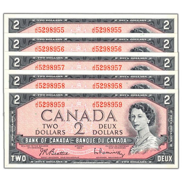 SOLD $2 1954 Bank of Canada Notes J/U Prefix BC-38b - 5 Consecutive Uncirculated