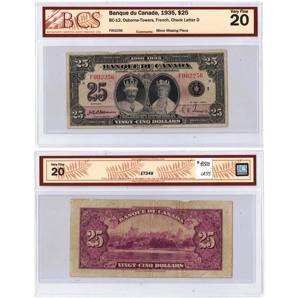 SOLD $25 1935 Banque Du Canada French Text Note BC-12 - BCS VF-20 (minor missing piece)