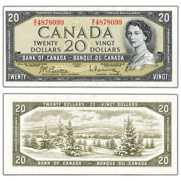 SOLD $20 1954 Bank of Canada Note Beattie-Rasminsky W/E Prefix BC-41b - AU/UNC Country: Canada Year: 1954 Denomination: 20 Dollars Signatures: Beattie-Rasminsky Prefix/Series: W/E Variety: Modified Portrait Catalogue: Charlton BC-41b...