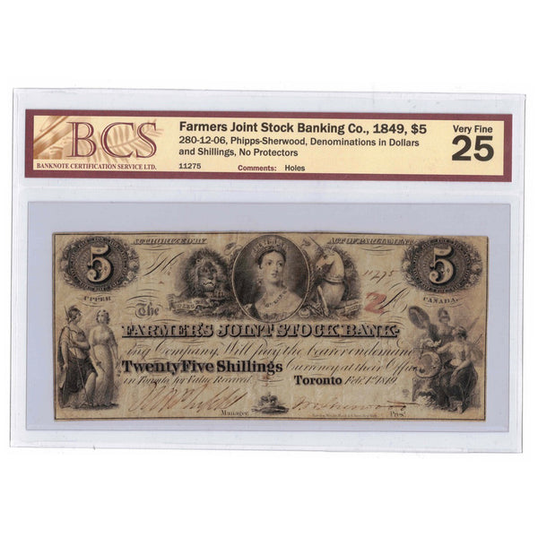SOLD $5 1849 Canada Farmers Joint Stock Bank Note - BCS VF-25