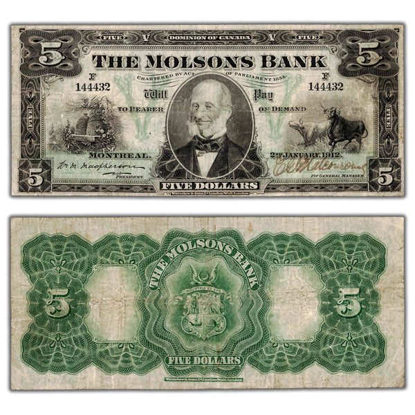SOLD $5 1912 The Molsons Bank Canada Chartered Note #490-32-02 - F/VF