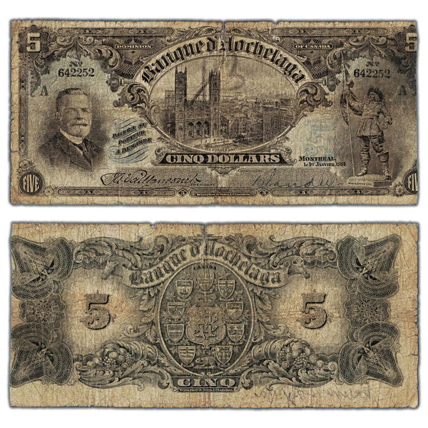 SOLD $5 1914 Banque d'Hochelaga Canada Chartered Note #360-22-02 - Trimmed Edge/Tears