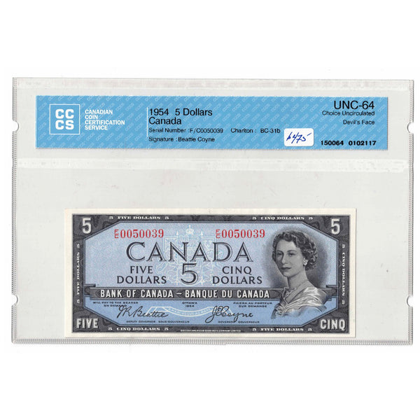 SOLD $5 1954 Bank of Canada Note Devil Face F/C Prefix BC-31b - CCCS UNC-64