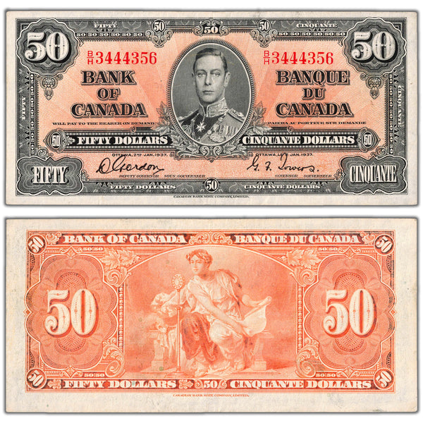 SOLD $50 1937 Bank of Canada Note Gordon-Towers B/H Prefix BC-26b - VF/EF (pressed)
