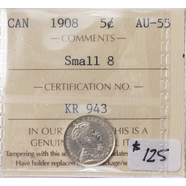 SOLD Canada 1908 Small 8 5 Cents Silver Coin - ICCS AU-55