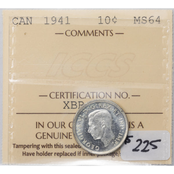 SOLD Canada 1941 10 Ten Cents Silver Coin - ICCS MS-64