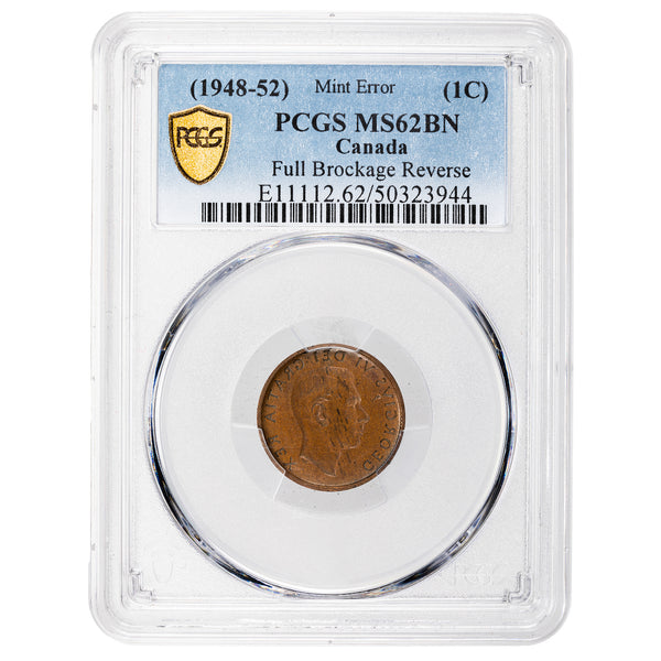 SOLD Canada Mint Error N.D (1948-52) 1 One Small Cent Coin - MS-62BN Full Brockage