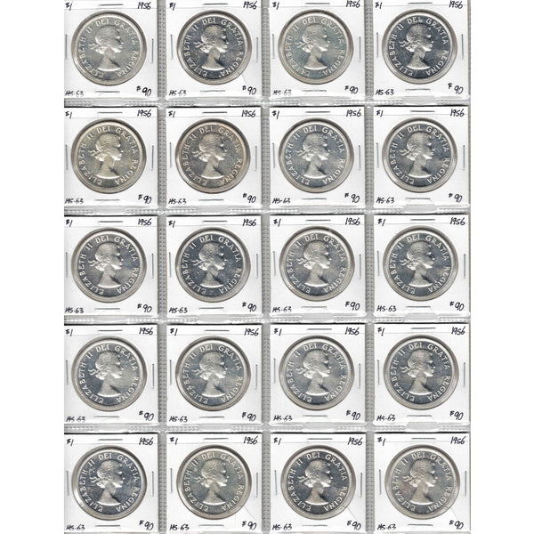 SOLD Lot of 20 Canada 1956 $1 Silver Dollar Coins MS-63 - Retail $1800