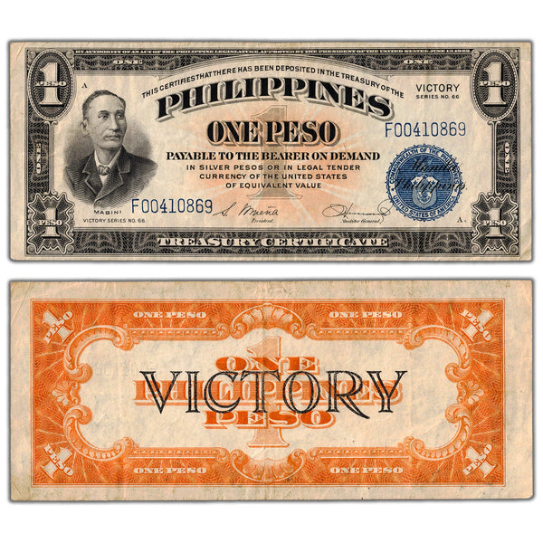 SOLD Philippines ND (1944) 1 One Peso Victory Note P #94 - VF+ Country: Philippines Year: No Date (1944) Denomination: 1 Peso Prefix/Series: Victory Series No. 66 Catalogue: Pick #94...
