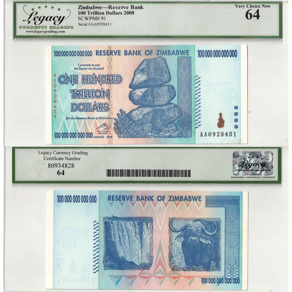 SOLD Zimbabwe 2008 100 Trillion Dollars Note P #91 - Legacy UNC-64