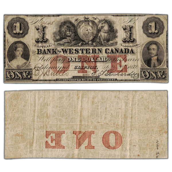 Available for sale is a $1 1859 Bank of Western Canada Chartered Note #795-10-04 - Small Pinholes SKU: 21148