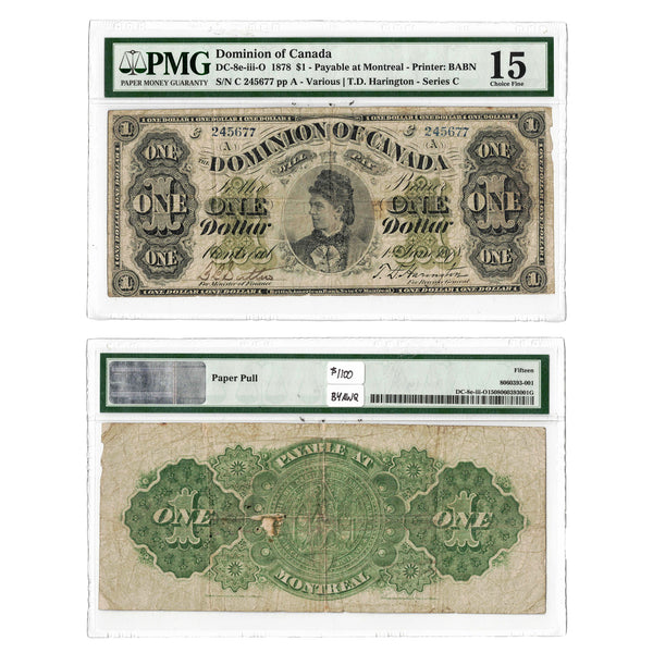 $1 1878 Dominion of Canada Note Montreal DC-8e-iii-O - PMG F-15 (paper pull)