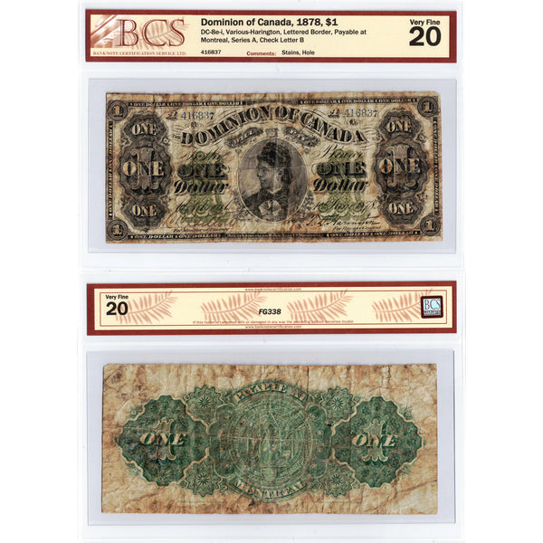 Available for sale is a $1 1878 Dominion of Canada Note Payable at Montreal Series A DC-8e-i - BCS VF-20 Country: Canada Year: 1878 Denomination: 1 Dollar Prefix/Series: Series A,...
