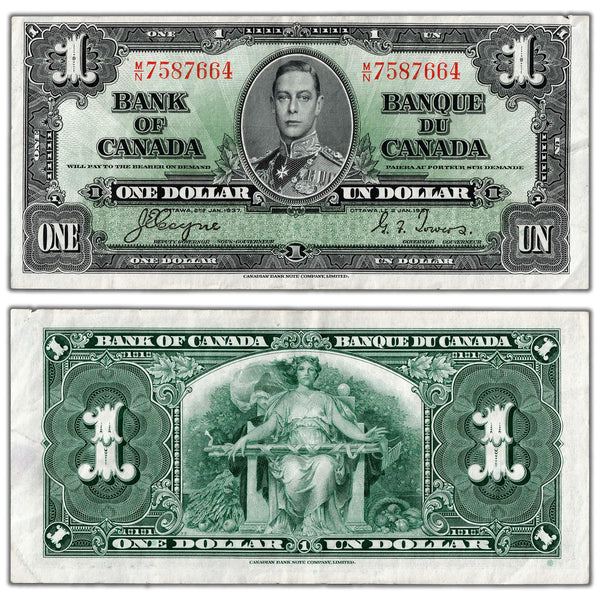 Available for sale is a $1 1937 Bank of Canada Note Coyne-Towers M/N Prefix BC-21d - EF (small tear)