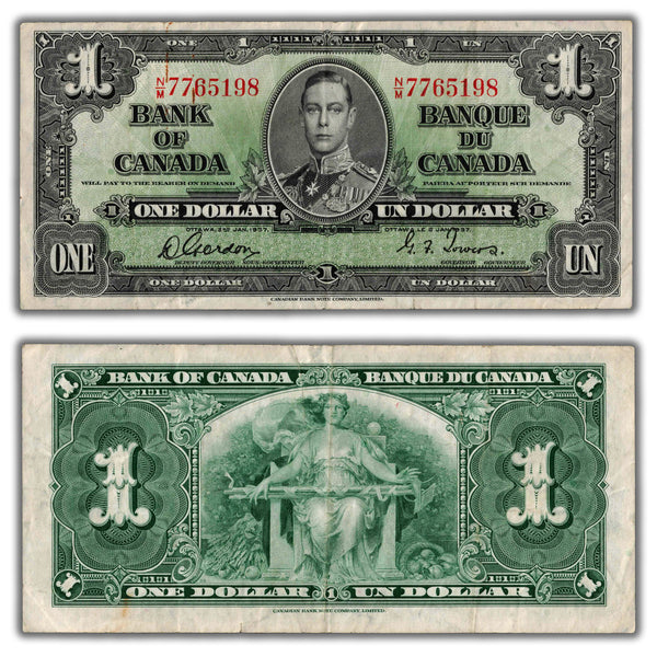 Available for sale is a $1 1937 Bank of Canada Note Gordon-Towers N/M Prefix BC-21c - VF (minor edge tear)