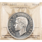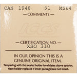 SOLD Canada 1948 $1 Silver Dollar Coin - Key Date - ICCS MS-64 SKU: XSO310