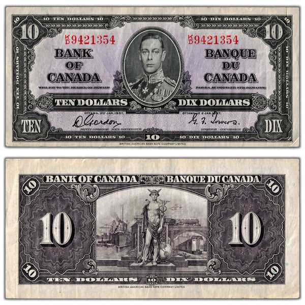 Available for sale is a $10 1937 Bank of Canada Note Gordon-Towers K/D Prefix BC-24b - VF+ Country: Canada Year: 1937 Denomination: 10 Dollars Signatures: Gordon-Towers Prefix/Series: K/D Catalogue: Charlton...