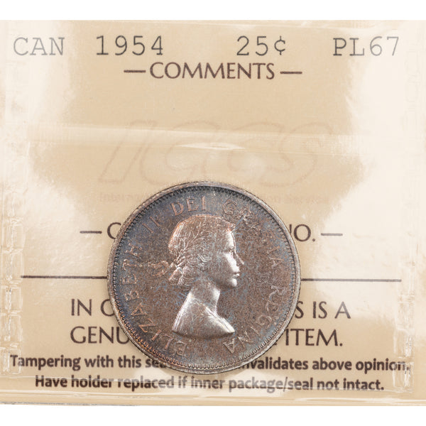 Available for sale is a Canada 1954 25 Cents Quarter Silver Coin - ICCS Proof-Like PL-67 SKU: XSO319