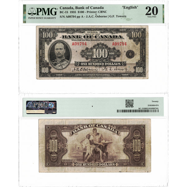 SOLD $100 1935 Bank of Canada Note English Text BC-15 - PMG VF-20 Country: Canada Year: 1935 Denomination: 100 Dollars Signatures: Osborne-Towers Prefix/Series: A Variety: English Text Catalogue: Charlton BC-15...