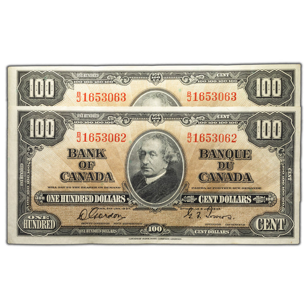 SOLD $100 1937 Bank of Canada Note Gordon-Towers BC-27b - 2 Consecutive - VF/EF