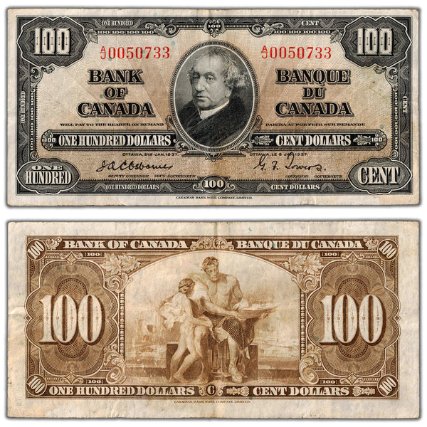 Available for sale is a $100 1937 Bank of Canada Note Osborne Signature BC-27a - VF Country: Canada Year: 1937 Denomination: 100 Dollars Signatures: Osborne-Towers Prefix/Series: A/J Catalogue: Charlton BC-27a...