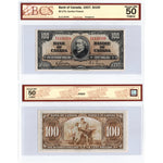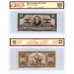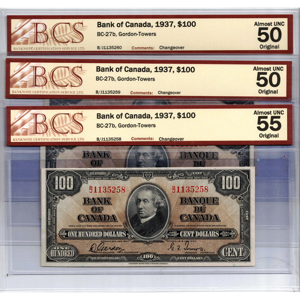 SOLD $100 1937 Bank of Canada Notes BC-27b - 3 Consecutive BCS AU-50/5 Country: Canada Year: 1937 Denomination: 100 Dollars Signatures: Gordon-Towers Prefix/Series: B/J Catalogue: Charlton BC-27b Grade: BCS AU-50/5...