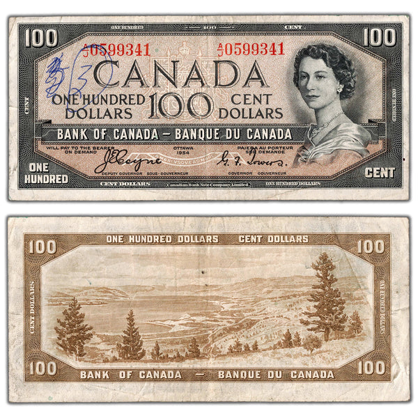 Available for sale is a $100 1954 Bank of Canada Note Devil Face A/J Prefix BC-35a - Writing