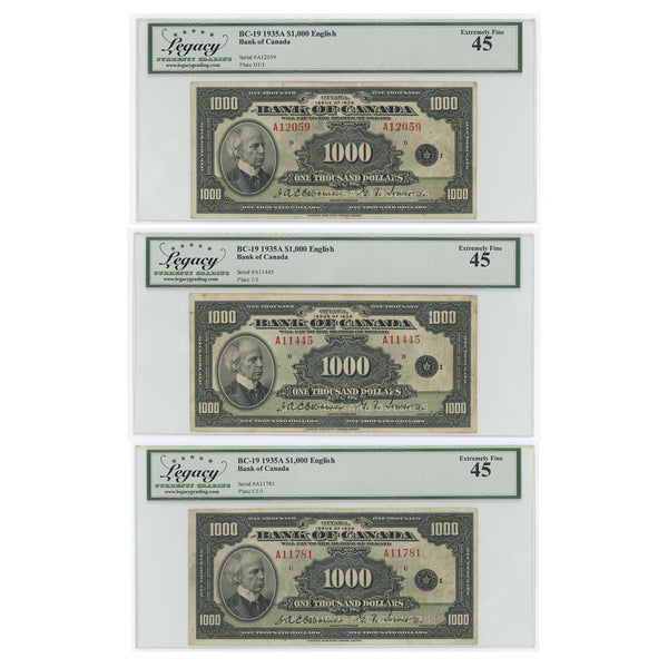 SOLD $1000 1935 Bank of Canada Notes English Text BC-19 - Set of 3 Legacy EF-45