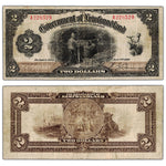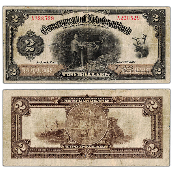 SOLD $2 1920 Government of Newfoundland Note NF-13b - F/VF Country: Canada - Newfoundland Year: 1920 Denomination: 2 Dollars Signatures: Hickey-Brownrigg Prefix/Series: A Catalogue: Charlton NF-13b Grade: F/VF Serial/SKU: A228529