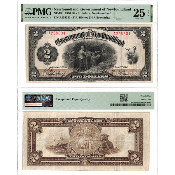 SOLD $2 1920 Government of Newfoundland Note NF-13b - PMG VF-25 EPQ