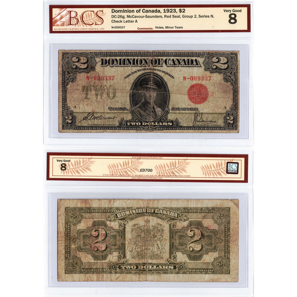 $2 1923 Dominion of Canada Note Red Seal Series N DC-26g - BCS VG-8
