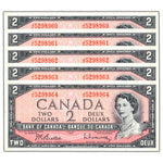 SOLD $2 1954 Bank of Canada Notes J/U Prefix BC-38b - 5 Consecutive UNC