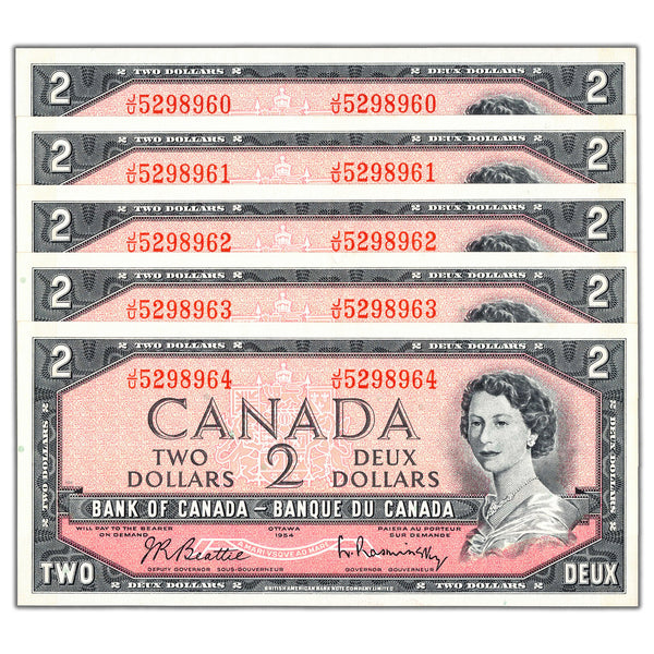 SOLD $2 1954 Bank of Canada Notes J/U Prefix BC-38b - 5 Consecutive UNC Country: Canada Year: 1954 Denomination: 2 Dollars Signatures: Beattie-Rasminsky Prefix/Series: J/U Variety: Modified Portrait Catalogue: Charlton...