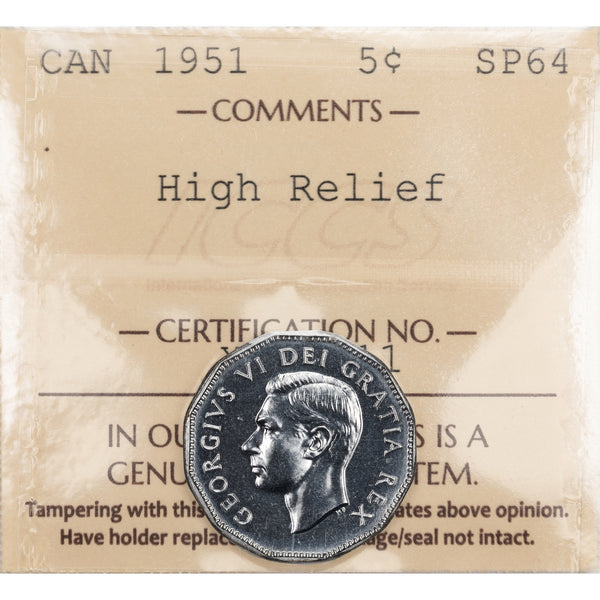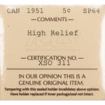 SOLD Canada 1951 High Relief 5 Cents Nickel Coin - ICCS Specimen SP-64