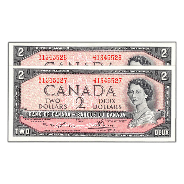 SOLD $2 1954 Bank of Canada Notes R/G Prefix BC-38d - 2 Consecutive Choice UNC