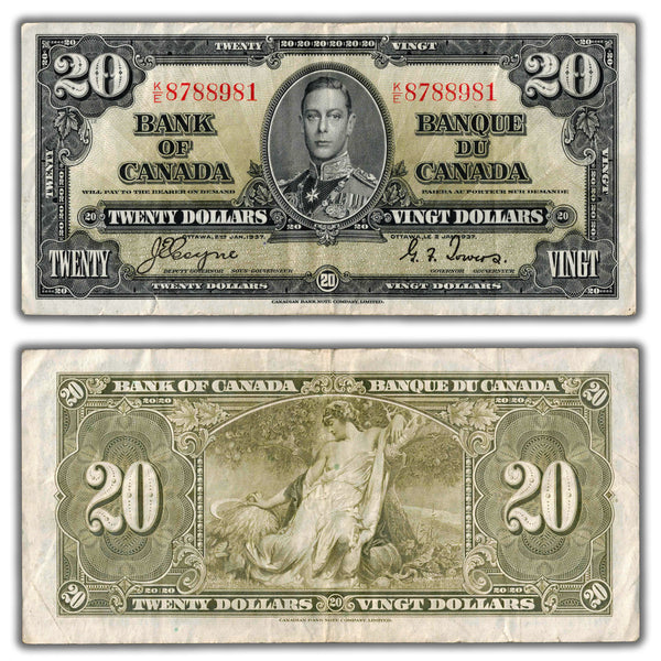 Available for sale is a $20 1937 Bank of Canada Note Coyne-Towers K/E Prefix BC-25c - F/VF (small tear)